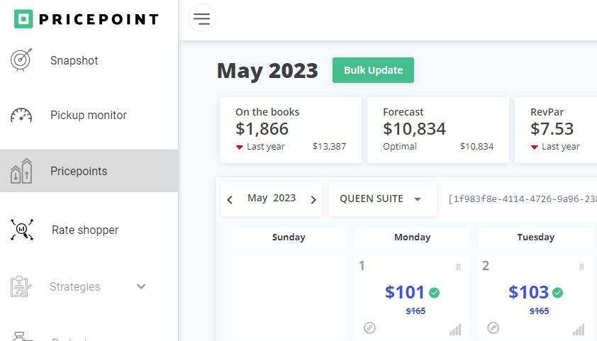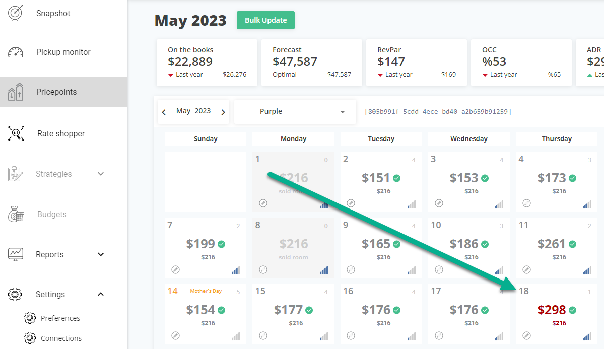 The blue font, on the contrary, indicates that the price recommendation is lower by +35% than your BASE RATE (STARTING PRICE). It suggests that Pricepoint cannot lower prices more and if you wanted to keep discounting you'd have to change the base rate.